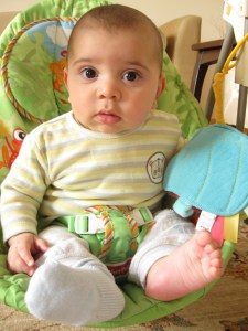 Baybars’ın her geçen gün büyüdüğünü ve değiştiğini görmek benim için çok heyecan verici… Artık her hareketime farklı farklı tepkiler veriyor. Kendi kendine oyunlar oynuyor. Elindeki oyuncakla sert zemine vurup ses çıkartmayı keşfetti. Otururken eğilip ayaklarıyla oynamasını izlemek çok zevkli. Değişik sesler çıkarmayı deniyor. Bu aralar, yalandan öksürüyor mesela. 🙂 Önce hasta mı oldu acaba diye düşünüyordum, sonra baktım, öksürüyor, ardından gülüyor. Oğuz’un değişine göre; ‘yeni “trend”i bu’. Tabii bir de vazgeçemediğiz tek çorap “trend”imiz var.
