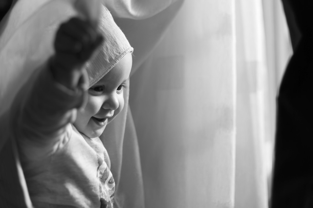 Sancak: giggling while playing with the drapery.